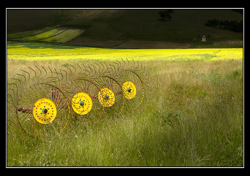molto bello il primo piano con questi attrezzi agricoli e intrigante la luce sulle pendici del Piano.