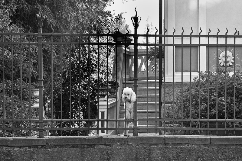 Uno scatto ripreso genuino dalla strada senza nessun tipo di alterazione e composto con cura, dove il soggetto principale è un cane di razza barboncino, ben curato, con il suo collare regolamentare, in una postura di attesa, in un contesto piuttosto familiare, una recinzione in ferro battuto di una casa signorile a livello della strada. L'uomo è assente. La scena si presta comunque ad una interpretazione seppur modesta. Il momento street sembra mancare: la posizione di attesa del cane, anche se eseguita con le zampe anteriori appoggiate, mimando un bipede, potrebbe essere mantenuta per diverso tempo senza che uno scatto fotografico eseguito dopo qualche secondo possa variare la scena. Anche la relazione fra la tua posizione di scatto e quella del soggetto fotografato non mette in evidenza una particolare volontà di sorpresa. Il risultato è una scena simpatica, molto curata nella forma ma debole dal punto di vista squisitamente street.