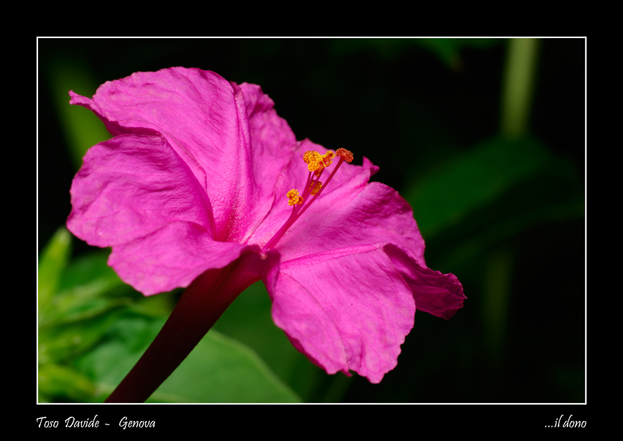 Credo che si chiama bella di notte, il suo polline sono perline o sfere dorate molto belle. Questo fiore per essere unicolore, non è tanto facile da fotografare, normalmente si impasta. In questo caso lo hai ripreso molto bene con il suo colore naturale. Complimenti  _________________ Pentax K5D + Pentax 16-45 + Tamron 90mm macro, Pentax 28mm + Sigma apo 70-300 +Pentax M 50 1,7 + cosina 100 macro. |