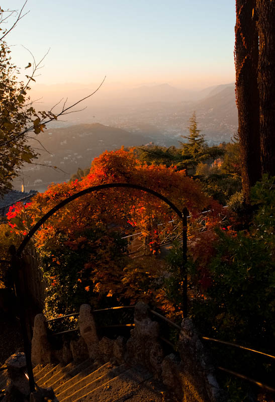 mi piace molto la parte del fogliame rosso, così intensa, la veduta della scala che scende, mi pare che dia una forte impressione di movimento, bellissimo il cielo che sfuma, l'orizzonte tra la foschia.
