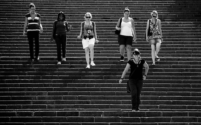 ottimo grafismo della scalinata...la posizione delle ragazze rende la foto davvero poco banale, i loro sorrisi concorrono splendidamente a renderla simpatica e spontanea.