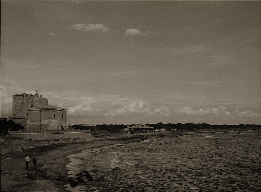 mi da l'impressione di una vecchia foto, uscita da un libro tenuto sugli scaffali. immagine di un mondo antico, di una passeggiata domenicale di una coppia su una spiaggia al limitare della città, senza turisti, perchè ancora non c'erano turisti, su una costa non ancora imbrattata da albergoni e ristorantoni, dove si poteva sdraiarsi su un fazzoletto d'erba a mangiare un panino.