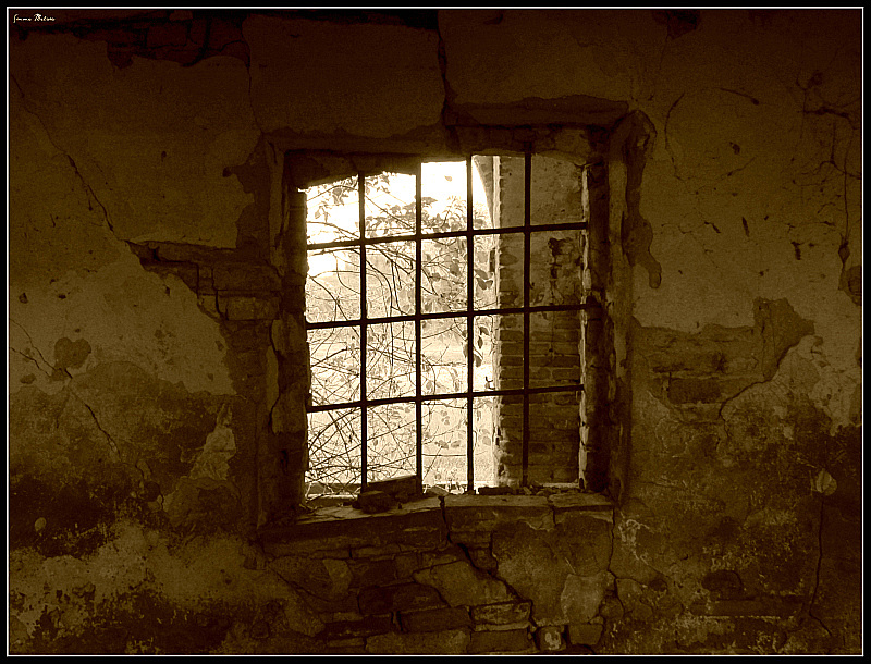 mi piace molto (a parte il viraggio, ma quello è questione di gusti) come si vede il mondo fuori dalla finestra a sommarsi a quel che incornicia la finestra (il muro malandato)è importante...forse avrei tenuto un formato quadrato appena più largo, a richiamare la finestra quadrata.