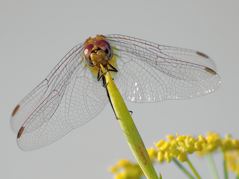 A controbilanciare la forte presenza della libellula i fiori nello sfondo, discreti e non invadenti, rendono armonica la ripresa.