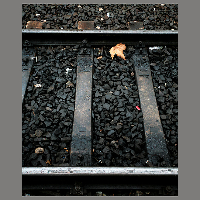 la foto assume un carattere essenziale e simbolico con questi motivi geometrici...il nero e il giallo della foglia a spiccare... per sottolineare questo aspettosimbolico avrei dunque prestato maggior attenzione alla composizione della foto per far assumere al tutto anche un rigoroso aspetto geometrico: avrei vercato di inserire nell inquadratura tutta la traversina che adesso risulta visibile solo permetaà sulla sinistra...cosi coem è adesso rende un po zoppicante il tutto e spinge lo sguardo ad andare oltre la scena inquadrata...