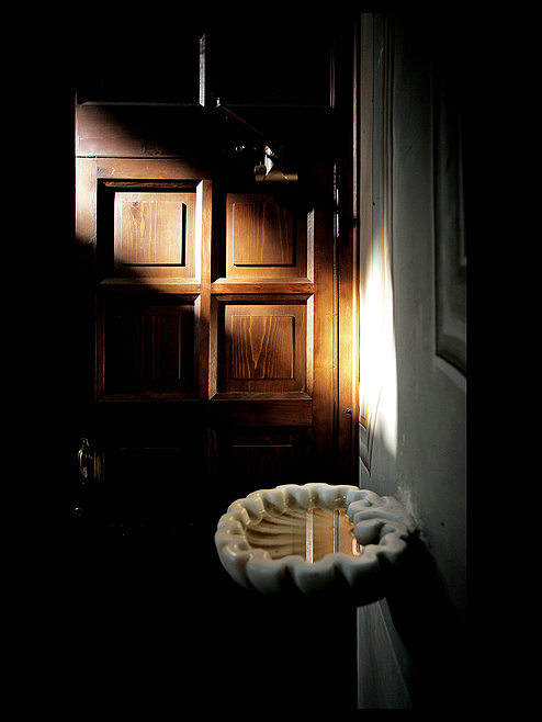 Peccato quel meccaniscmo automatico di chiusura della porta che cozza con la bella resa della luce sui legni della porta e sull'acquasantiera.
