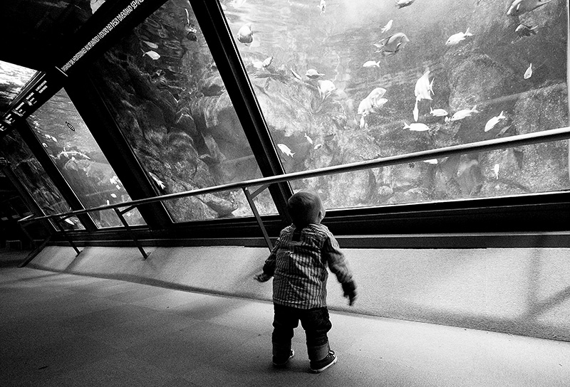 Questo scatto mi piace molto, l'inclinazione delle vetrate con il corrimano a mio avviso concorre a spostare l'equilibro della composizione, che sembra quasi incombere sul bambino dalla postura singolare, che ammira il mondo acquatico in movimento.
