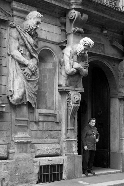 l'ironia scaturita dall'interazione dei vari elementi narrativi è lampante e ben colta: soprattutto bravo nell'aver saputo fermare la postura delle mani del portiere d'albergo, nella classica posizione di attesa che richiama e rafforza l'espressione delle due statue. La direzione degli sguardi marmorei rafforza il essaggio e l'interazione si rende ancor più vivida. Azzeccata la scelta del bianco e nero e la sua realizzazione. Equilibrata negli elementi compositivi, semplice pulita e gustosa...