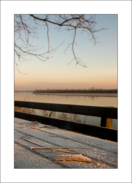| La luce dorata che sfiora la foglia racchiusa nel freddo della brina è formidabile. Il resto che progressivamente si sfuoca con dolci e tenui tonalità fa da contorno al bel tavolo gelato dove s'è posata e immobilizzata la foglia e dove si posa lo sguardo. La composizione è come al solito curata in tutti i dettagli e nulla è lasciato al caso: le diagonali per dare più profondità, i rami per dare sostanza alla parte alta dell'immagine, il grande fiume a contestualizzare lo scatto.