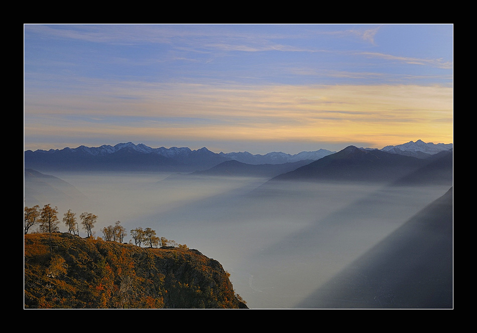 Un'immagine affascinante composta alla perfezione, molto belli i fasci di luce che filtrando dalle montagne accentuano la presenza della foschia del fondovalle, i miei complimenti.