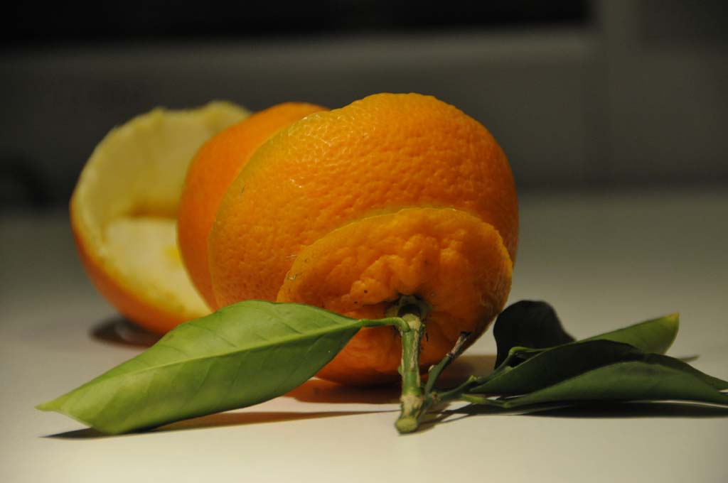 Personalmente non avrei inserito la parte bianca della buccia, attrae la mia attenzione distogliendomi dal primo piano che reputo più interessante. Anche le foglioline andavano inserite nel fotogramma e non tagliuzzate. Tolto ciò la foto mi piace. Wink