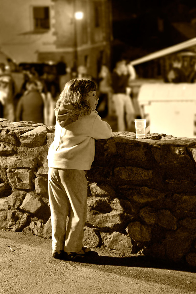 Solo la centralità della protagonista rovina (ma tanto per dire) la scena catturata, la bimba sembra contemplare il mondo che si trova davanti, il bicchiere d'acqua a tenerle compagnia, avverto una sorta di analogia con i vari atteggiamenti degli adulti, una situazione di effimero equilibrio fra il reale e l'inreale.