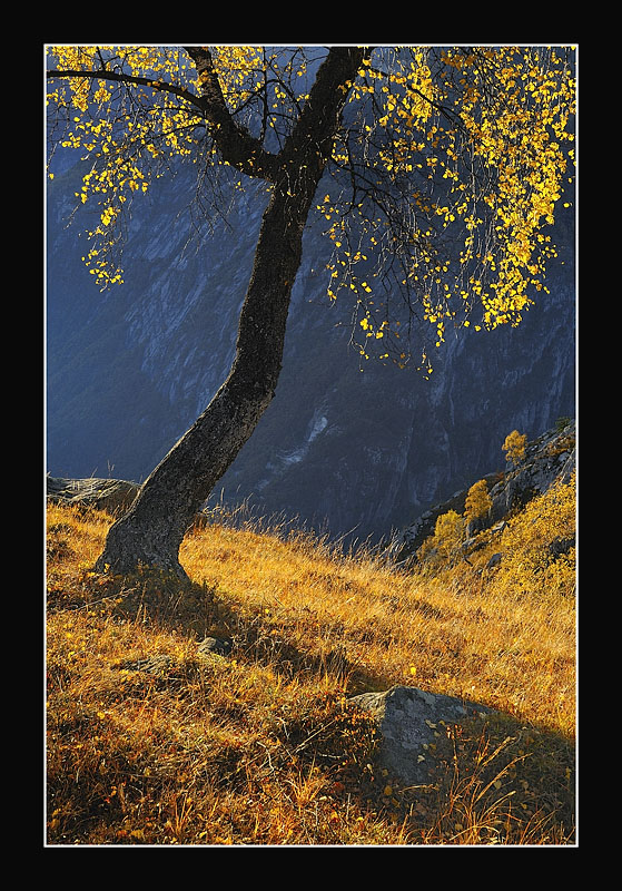 La luce sapientemente gestita mette bene in rilievo il soggetto, oltretutto equilibrato anche da un punto di vista cromatico, ma quello che secondo me è il maggior pregio della foto, è la scelta compositiva, che con il taglio della parte alta della chioma rende l'immagine molto più interessante rispetto ad un'inquadratura che avesse proposto l'albero inquadrato per intero.