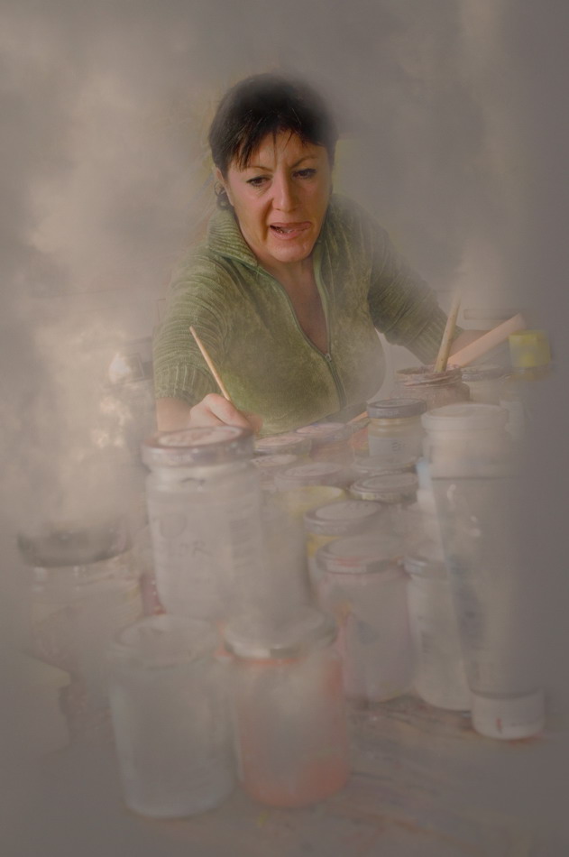 Mi piace molto l'espressione della pittrice, così concentrata e compresa nel suo lavoro e lo sfocato tutto intorno, quasi che lei non vedesse altro che l'opera che è nella sua mente, complimenti Ok! l