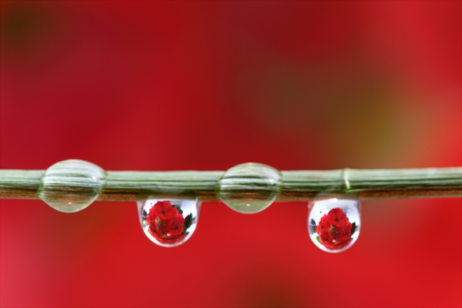 La difficoltà in questo tipo di foto consiste nel posizionare l’oggetto che viene rifratto nelle gocce in maniera ottimale. Non si tratta della messa a fuoco classica in quanto si fotografa un oggetto non piano in una goccia d’acqua che non è perfettamente sferica. La rifrazione genera problemi di distorsione ottica soprattutto quando si tratta di più gocce, perché quella direttamente in linea tra obiettivo – goccia – oggetto subisce una distorsione minima e diversa da quelle laterali ove è più accentuata dando una sensazione di sfocato.