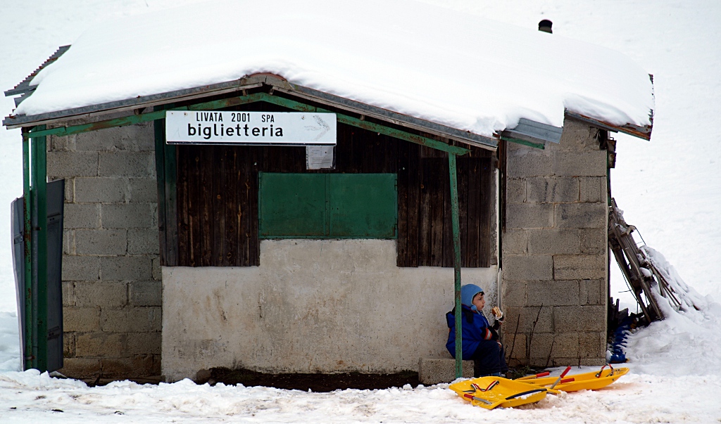 io guardo la scena e vedo una baracca malconcia, almeno da quei muri realizzati cosi in modo grezzo, mi da l'idea di abbandono, sicuramente non molto curata, e la scritta ''biglietteria'' con i sportelli chiusi e il ragazzo che nell'attesa mangia un panino, con il bob ai suoi piedi è di per se già una scena abbastanza ironica e simpatica.