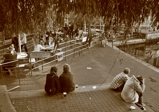 le due coppie sono ben distinte fra di loro, come tono: scure le prime chiare le seconde, elencate come ordine di importanza, distinte anche la posa e le loro bevande , un tema, secondo me, un pò audace, poteva nascerne un grande foto, se magari avevi un pò di pazienza e aspettare che scattasse la scintilla...il famoso attimo.