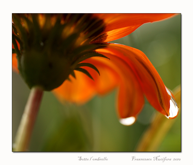 ecco, questa mi piace un sacco, e secondo me lo stelo sullo sfondo ci sta bene perchè riprende quello del fiore in primo piano. Mi eccessiva la luce nella goccia più a destra, magari dal raw si potrebbe tirare fuori qualcosa... IMHO