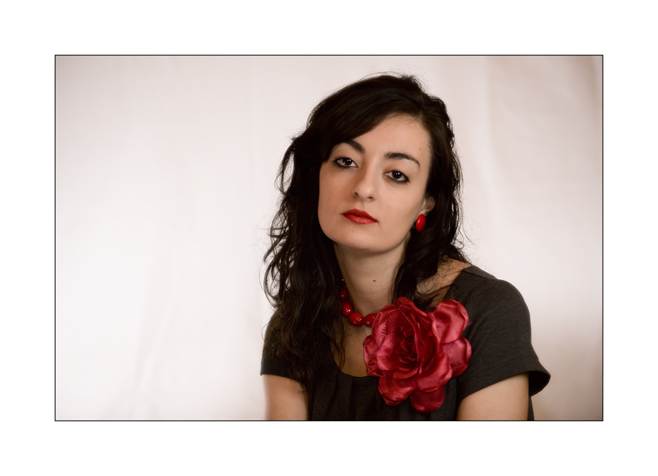 Due appunti: avrei "allargato" i capelli a coprire la pelle sopra il fiore, e forse un solo punto luce riflesso negli occhi mi avrebbe aiutato a guardare Manuela in modo più diretto. Amp,