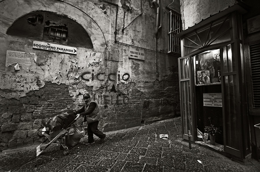 l'inquadratura attiva di questa fotografia accoglie in perfetta simbiosi l'uomo ed il suo ambiente. Un autoctono del centro storico napoletano apparentemente in antitesi con il luogo viene ad instaurare una forta complicità con lo spectator: per un attimo diventa il protagonista indiscusso di questa street-scene dove i molteplici simboli visivi, aperti a qualsiasi interpretazione, potenziano l'effetto del racconto. Molti i contrasti di contenuto, tutti visibili e fruibili senza il ridondante titolo. Il contesto urbano meravigliosamente inquadrato, rivela alcune traccie di napoletanità, la sua religione, i suoi miti, i suoi eroi, i suoi ritmi, il suo "modus operandi". Bianco e nero di riferimento.