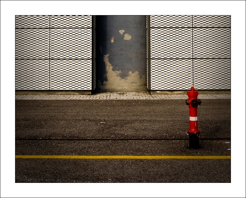 Un gioco di linee parallele e perpendicolari, che disegnano strane rientranze tra pannelli ad effetto visuale, il tutto conditi con pochi ma forti colori...un rosso che decentra ed un giallo che riequilibria....e viceversa ovviamente....