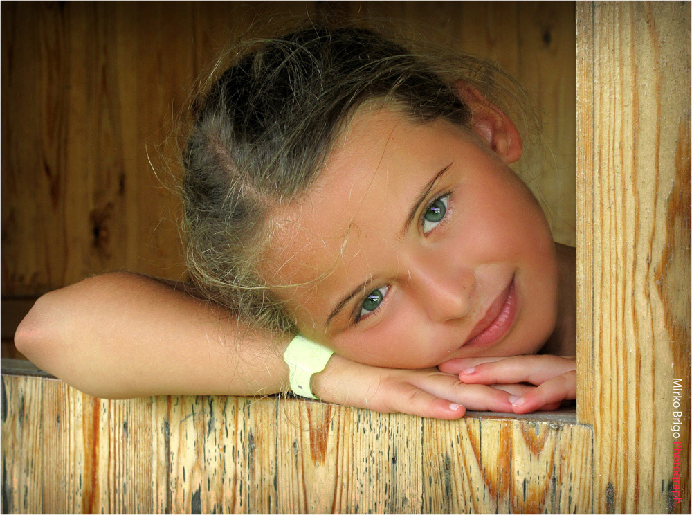 Piacevole l'espressione colta sul volto di questa bella bambina dai grandi occhi verdi. In particolare è il modo in cui è adagiata la testa con dolce inclinazione sulle mani cicciotte di bimba che trasmette molta tenerezza e serenità. Anche la cornice visiva del legno inquadrato concorre all'esito dell'immagine.