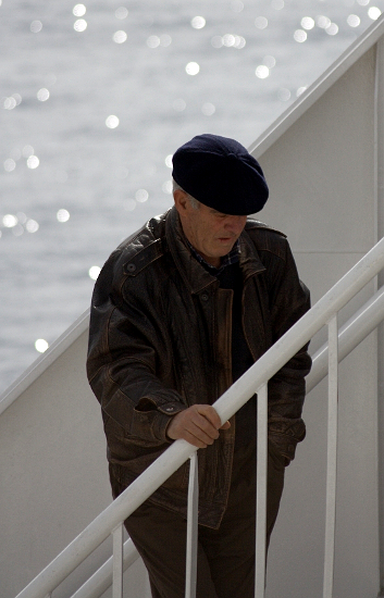 La foto forse non è proprio ineccepibile tecnicamente, ma l'equilibrio delle linee geometriche della nave, e lo sguardo accigliato del soggetto rivolto proprio sulla verticale opposta creano un simbolismo abbastanza forte, evocano un senso di amarezza e rimpianto, quasi da emigrante che lascia la propria terra.