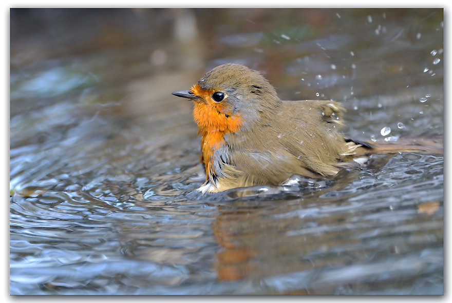 ormai seguo con estrema attenzione ed ammirazione i tuoi scatti, qui è vero il piccolo pettirosso sembra in discesa verso una cascata, ma aldilà dell'orizzonte storto (il perchè lo hai già ampiamente spiegato), la qualità dello scatto è altissima, nitidezza disarmante e bellissimo il momento colto con le goccioline sospese in aria... complimenti ancora una volta! Ok!