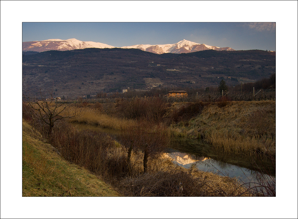 ....interessanti molti dei particolari ripresi nell'immagine, trovo però molto debole la "fascia" centrale ( in senso orizzontale )....addirittura penserei a due immagini distinte, la parte superiore dove sono presenti le montagne e la parte inferiore con il corso d'acqua e il riflesso... case,casette,recinzioni e paletto mi pare che disturbino parecchio lo scatto...