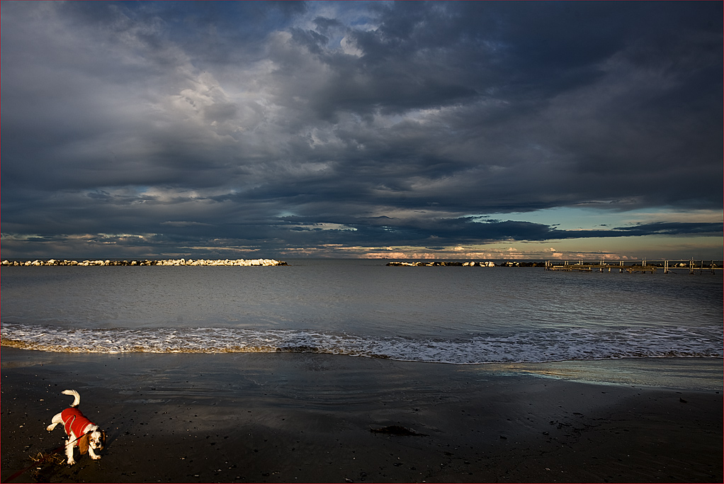 Il cane è venuto un pò "sparato" perchè è in un punto dove la luce radente della sera lo illumina in pieno, i punti più scuri sono le ombre lunghe degli alberghi che arrivano ben oltre la riva e per bilanciare i chiaroscuri mi son "bruciato" il cane Very Happy