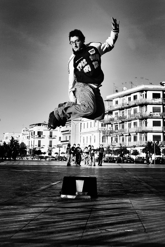 Nella tua foto mi da l'impressione che il pattinatore si fonda con i palazzi nello sfondo.