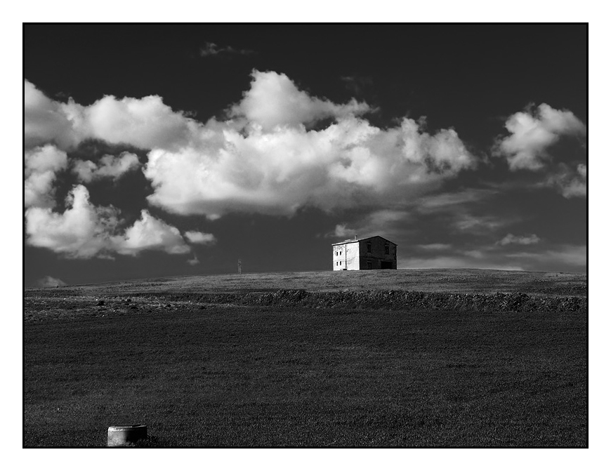 Stupenda la presenza di quel casolare con una facciata illuminata dal sole e una facciata quasi completamente scura. IL cielo, con quei bei nuvoloni, contribuisce a rendere la foto esteticamente più bella. Sono invece in dubbio riguardo alla presenza di quell'elemento in primo piano: lo vedo quasi più come elemento di disturbo... forse avrebbe semplicemente giovato un po' più di spazio sotto. Complessivamente mi piace, e non poco