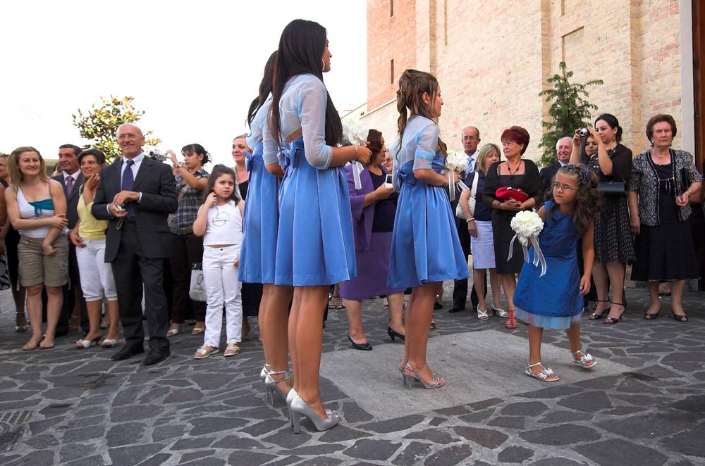 Questa istantanea dal sapore decisamente street si offre alla lettura a prescindere dalla situazione precedente o seguente: ci offre un istante di vita. La fotografia, interrompendo il "continuum" percettivo, scieglie la frazione di secondo in cui il caos si organizza all'interno del fotogramma regalandoci l'espressione di una bambina colta in uno stato d'animo di attesa, che nasce all'improvviso dal continuo fluire. Lei, la più piccola di tutte le damigelle ma messa in prima fila davanti a tutte, , con le sue piccole scarpe basse, viene fermata in una postura che rompe gli schemi di composto ordine e di attesa. Il contrasto che si viene a creare con il resto dei personaggi è favoloso. Tutto diventa, allora, piacevole: i colori e le forme dei vestiti delle damigelle, i tacchi lunghissimi e lucidi delle loro scarpe da cerimonia, la cura delle messe in piega dei loro capelli. E poi l'occhio è libero di vagare sui personaggi dello sfondo, eterogenei e curiosi (la signora anziana sulla destra che dorme in piedi è una favola Very Happy ma anche la signora a braccia conserte sull'estremo sinistro del fotogramma con il suo abbigliamento leggero e informale quasi da imbucata...... per finire sulla bimba in mezzo che guarda l'eleganza delle damigelle e si tocca i capelli come per esternare un desiderio di emulazione. Quanto sono belli gli esseri umani....... Composizione ottima.
