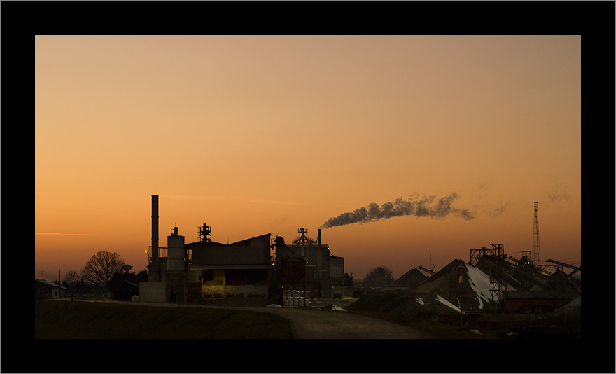 Molto bella..particolarmente di mio gusto la disposizione degli elementi architettonici...traliccio e ciminiera spenta ai lati...ciminiera in attività al centro...mi piace moltissimo la resa dei toni...quasi da pittura olandese...