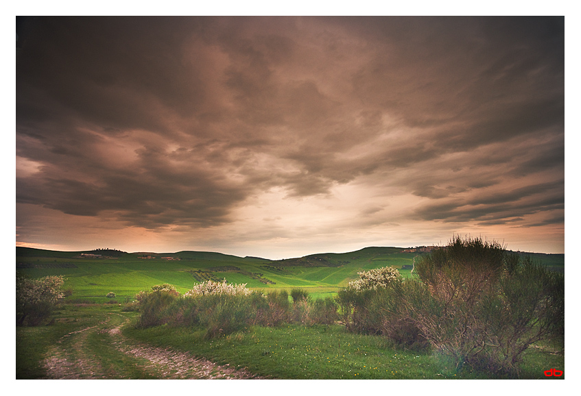 1) nella prima foto ho lavorato sia con filtri (ND e GND) che con correzione selettiva dell'esposizione in ACR. Il fine era quello di donare drammaticità al cielo e di laciare in "piena luce" il verde dell'erba.. Magari ho esagerato un po' con le spennellate, ma a mio avviso raggiunge il suo scopo (leggera surrealità).