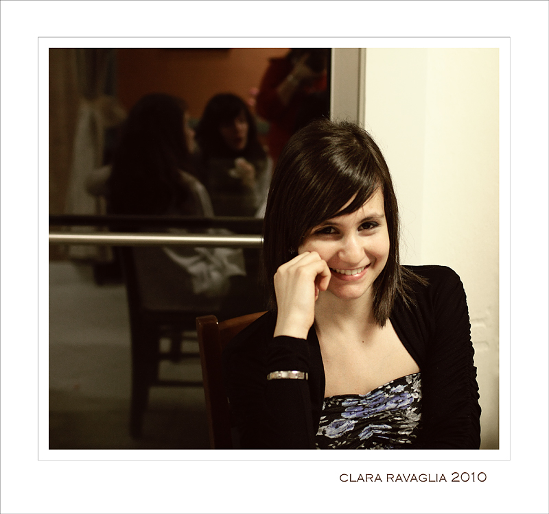 Ho letto grossomodo tutto, io sono decisamente più prosaico, vedo un bel ritratto con una brutta ombra sull'occhio, vedo un sorriso bello, sincero e con una sfumatura di imbarazzo e con un'ombra un pò meno brutta. Mi piace molto l'inserimento delle due figure riflesse mentre mi piace meno che ci sia anche la presenza della fotografa su un lato.