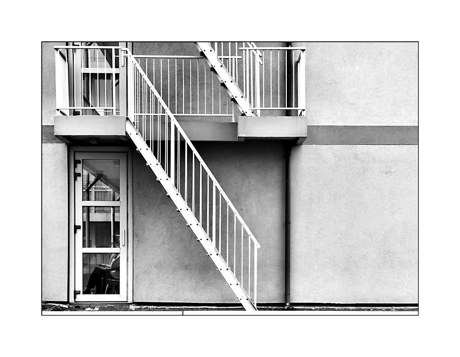 interessante invece la figura seduta dietro la porta o di riflesso sulla stessa che rompe gli schemi rigidi delle linee e delle geometrie...