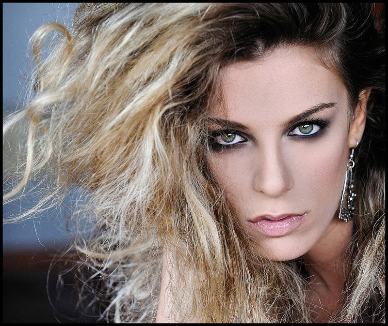 Bello il taglio ravvicinato, e la "interpretazione" di questo sguardo diretto e limpido. Molto forte a mio parere la maschera di contrasto, che in alcuni punti del viso ( complice la pastosità del trucco, al centro delle gote) tende a rendere troppo presente la tessitura della epidermide.