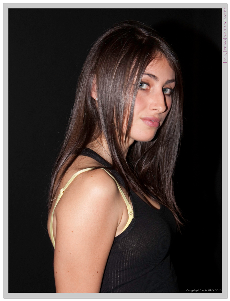 Sembra una foto scattata in piena notte con il flash incorporato sulla macchina.. la macchina fotografica ha bilanciato come poteva, il limite è nell'illuminazione. Spero che tu ti sia fatto dare il numero di telefono dalla modella, varrebbe la pena riprovare con delle luci più adeguate  |