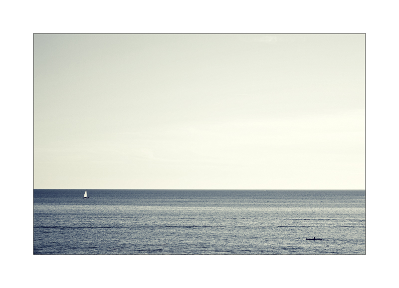 Due piccole presenze. Una bianca verso l'orizzonte, l'altra all'angolo opposto, scura e filante. Diversi modi di procedere nel mare ma entrambe punti focali per ben descrivere la grandezza della scena.