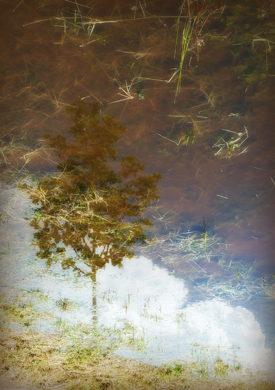 Prima di tutto mi permetto di farti gli auguri per la salute, visto che ce ne hai parlato. Ma passo subito dopo a complimentarmi per questa immagine. Ho visto anche la successiva che hai postato, in orizzontale, ma preferisco questa: un solo albero protagonista, tutto più elegante ed equilibrato. Colpisce la sfumatura incerta, un po' marcescente del verde, il quasi ristagnare del colore nell'acqua. Ma in questa immobilità traspare la chiarezza delle nubi in cielo e la figura eretta dell'albero, il suo esserci in delicatezza oltre la barriera liquida che separa due mondi. Una foto che pare esprimere un disagio, ma anche indicare la voglia di vedere oltre il guado, di cercare chiarezza e serenità, di non fermarsi mai alla superficie delle cose.