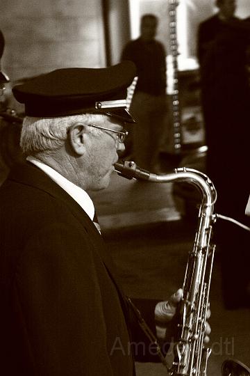 Mi piace lo sfondo che dà l'idea della gente che si fa i fatti suoi mentre la banda suona. Peccato che non si veda in faccia, ma anche l'idea di ritrarre un signore anzianotto che suona il sax mi sembra ottima.