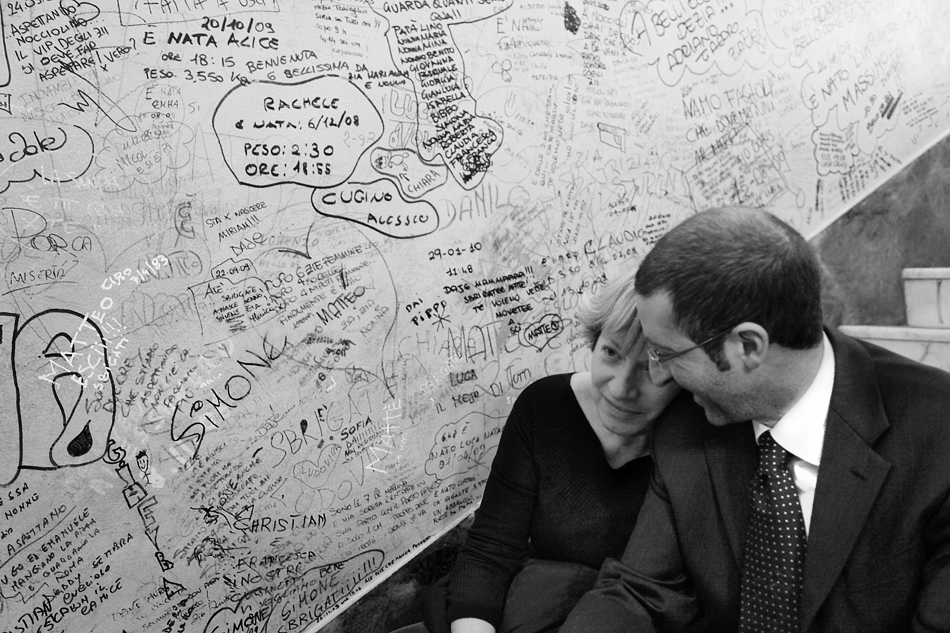 Ricordo che in una mia proposta street, belgarath bocciò le scritte troppo presenti...questa sfilata di graffiti fa' tenerezza...un miscuglio di promesse d'amore...figli in arrivo...figli appena nati...la coppia sembra racchiudere nel gesto dolce di lei sul capo di lui tutte queste scritte...tutti questi momenti di sincera felicità...di sincera speranza...mi piace davvero molto...presumo fosse pure lei in attesa e mi sorge il dubbio sia la scala che porta a qualche ospedale...