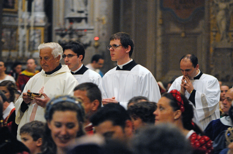 Nel dettaglio, problemi tecnici a parte (quelli già rilevati da Katia) la 01 sfugge alla linea logica delle altre e nel mezzo lo si coglie piuttosto bene, quindi la leverei, ma non per eliminarla, bensì per usarla come foto di apertura. E' infatti uno scatto che, visto poi con gli altri e indipendentemente dal fatto che sia stato preso all' inizio della cerimonia o meno, ha il sapore d' introduzione: non è inquadrata la gente, l' altare è vuoto (*), l' atmosfera di silenzio o di organo in sottofondo è palpabile e i due chierici hanno l' atteggiamento tipico della preparazione e quella particolare, velata complicità che chi è cresciuto all' ombra del campanile coglie immediatamente come peculiare di questi momenti.