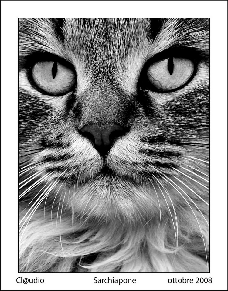 Il musetto dal dettaglio estremo si ammorbidisce solo sulla pettorina chiara, dove la morbidezza chiede quasi una carezza. Austero ed elegante, pieno di dignità felina se così si può dire. Ed a questo concorre anche la forza del contrasto che introduce note di decisione e regalità..