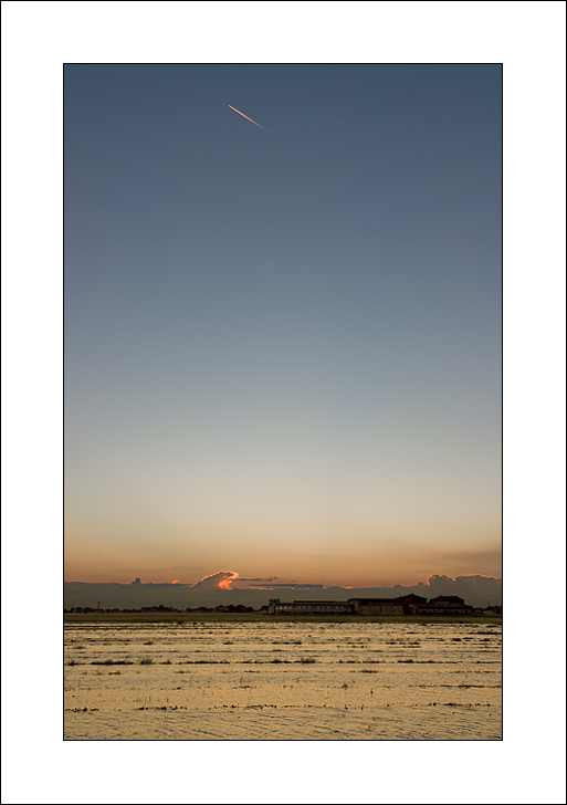 Piace osservare il gioco di corrispondenze intercorrente fra il cromatismo della scia e quello del profilo della nuvola.