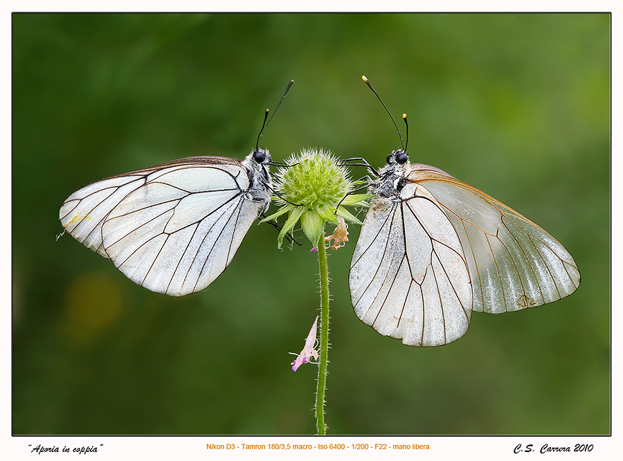 Capita raramente di trovare due farfalle sullo stesso fiore, così preso dall'entusiasmo piazzo il cavalletto controllo la messa e fuoco, l'inquadratura, l'esposizione 1/20 F22 Iso 800 al momento dello scatto inizia a soffiare un pò di vento, allora aspetto un pò, il tempo è troppo lento per avere una foto ferma, dopo qualche minuto le condizioni non cambiano e se le farfalle scappano?