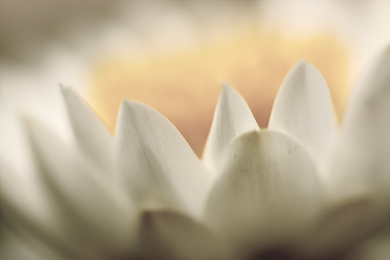 Il cuore appena intravvisto di questo fiore ha un punto di giallo molto bello, che si stempera nello sfocato, con una saturazione che cede qualcosa in densità, ma acquisisce in cambio nuove ricchezze in delicatezza.