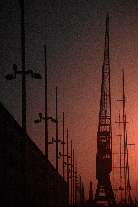 Incredibile come hai saputo accostare queste linee ostruttive, queste sagome di elementi marinari, così diversi, lontani nel tempo e nello stile l'uno dalla altro anni luce, eppure come cristallizzati dalla post ( assolutamente personale e non sindacabile) in una forma stabile ed omogenea, a cantare un solo canto, in armonia. Trattamento oscuro della scena, tutto recede lentamente nell'ombra e nel rosso sangue. Mi piace osservarla.. e, sapendo che è un tuo lavoro, di un autore di cui ho imparato a conoscere un po' il gusto paesaggistico nel vedere i lavori altrui, sempre pronto ad apprezzare immagini pulite, limpide, di respiro ampio e lontane dalla complessità..: qui mi pare di scoprire per la prima volta il rovescio di una medaglia.