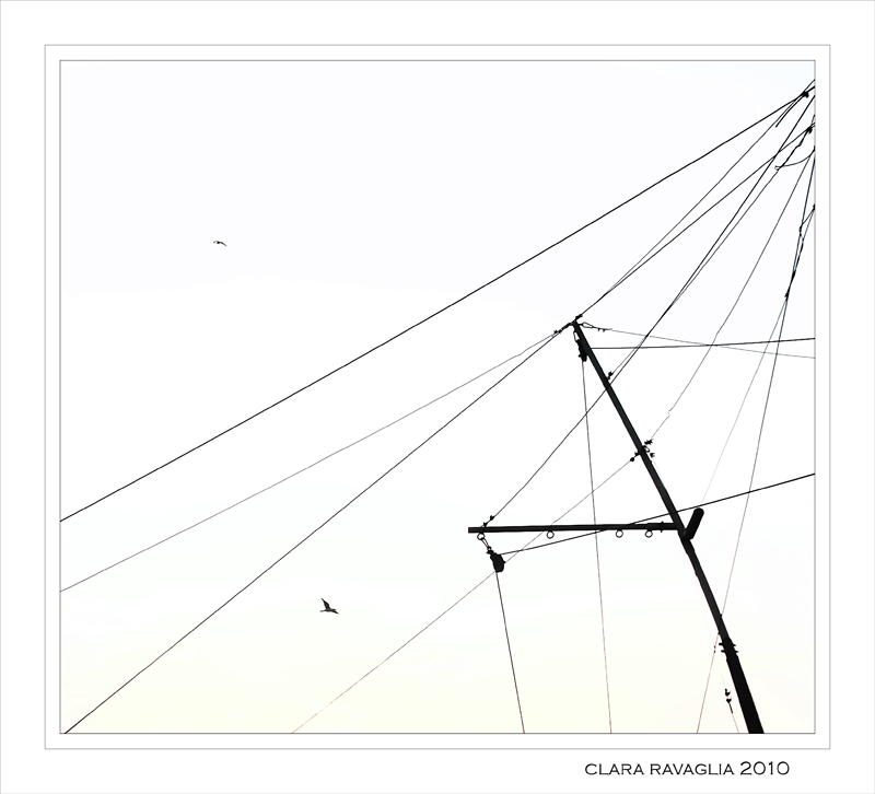 Un paesaggio fatto di linee e fili...avrei cercato personalmente di far partire le linee dagli angoli...ma si tratta di una pura pignoleria...bellissima questa coppia in volo...quei legni aperti come due braccia sembrano l'invito ad una sosta...mi piace molto...